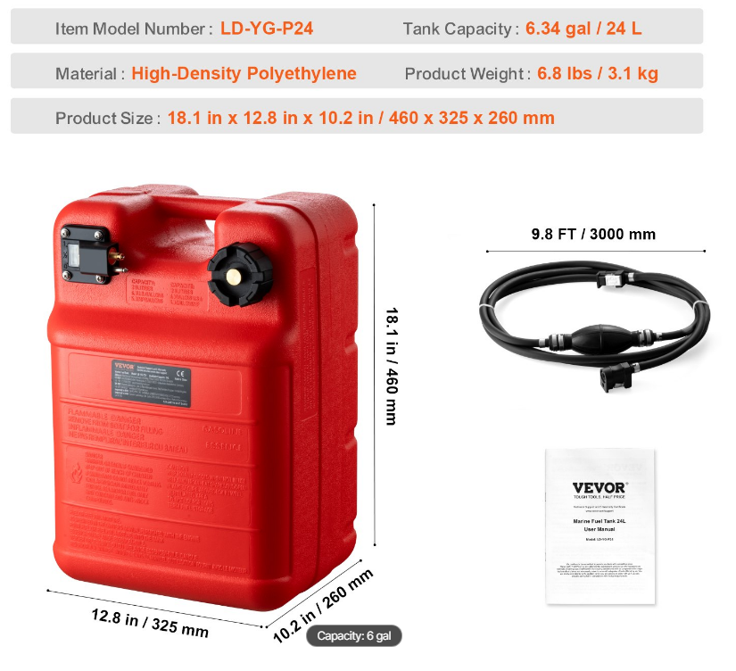 1852, Bensintank med bensinmåler og slangesett, 24L, CE-godkjent EN 10168:2004
