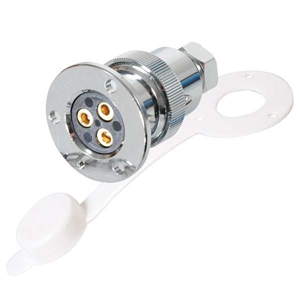 1852, Dekkplugg 3-polet, 3 Amp, 12V, Forkrommet messing med pakning og plastdeksel på kjede