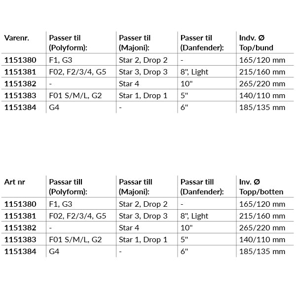 - Innvendig Ø: Topp 265 mm / Bunn 220 mm