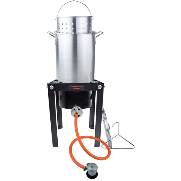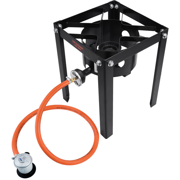 - Innhold: Gassbrenner, 1,2 meter slange med regulator, stativ, aluminiumsgryte (32liter), solid innerrist