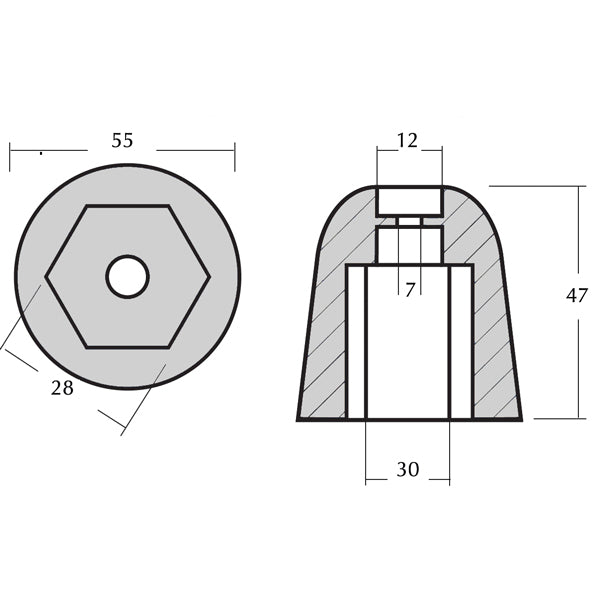1852, Sinkanode for Vetus baugpropell KGF 125 & 160, Høyde 47 mm, Ø 55 mm
