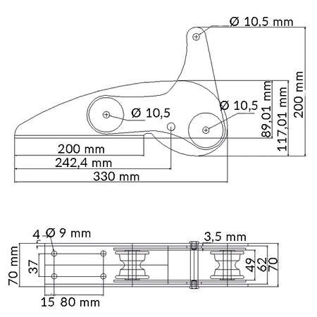 1852, vippbar ankerrulle Aisi 316, maks 10 kg, 70 mm x 330 mm