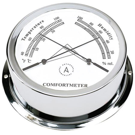 Autonautic Thermohygrometer TH95C er en del af Atlantic 95-serien med en base på 95 mm og hvid skive. Instrumentet kombinerer termometer og hygrometer i ét kompakt design, fremstillet i forkromet messing for maksimal holdbarhed og stil. Udstyret med Easy Fix System, som giver nem adgang til justering uden afmontering. ISO 9001-certificeret kvalitet og håndlavet i Barcelona – ideelt til både, campingvogne eller som en del af en skræddersyet vejrstation.Autonautic Thermohygrometer TH95C er udviklet til dig, der ønsker præcision, funktionalitet og klassisk maritimt design i ét instrument. Som en del af den populære Atlantic 95-serie har dette kombiinstrument en base på 95 mm, en elegant hvid skive og et kabinet i forkromet messing, hvilket giver både robusthed og et tidløst udtryk.