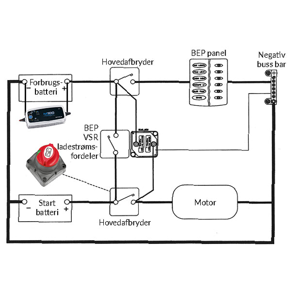 - Isolering av startbatteri: Ved bruk er startbatteriet isolert ved 12,8 volt for å sikre startstrøm.
