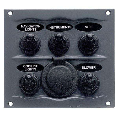 BEP, Sprutsikkert elektrisk panel, 5 kontakter + stikkontakt 12V, IP56, 95 x 107 mm