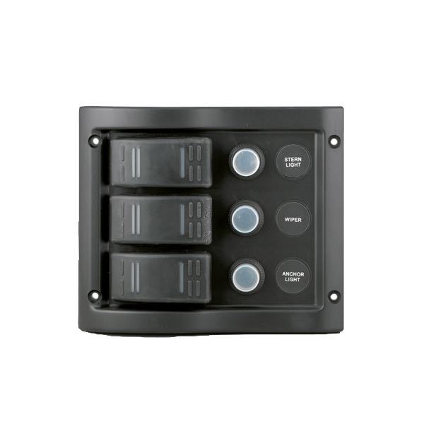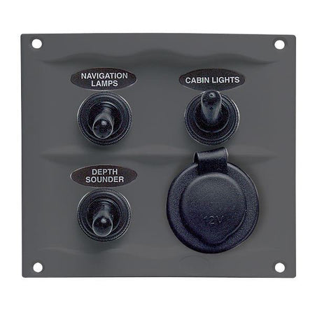 BEP, Sprutsikkert elektrisk panel med 3 brytere og stikkontakt, 12V, IP56, 95 x 107 mm