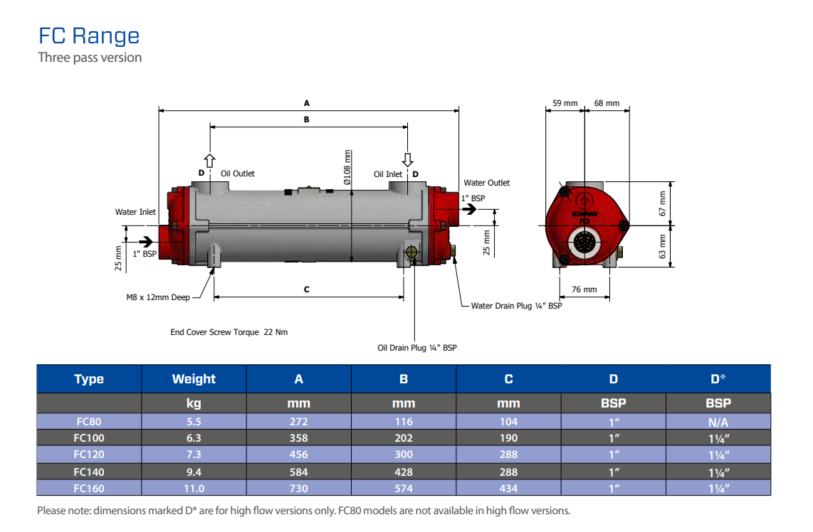 Bowman Oljekjøler FC80 1" olje, 1" bsp hydraulikk, 13,0 kW, 272 mm, 140 ml, 1/2" vanninntak, 80 ml, Ø 113 mm