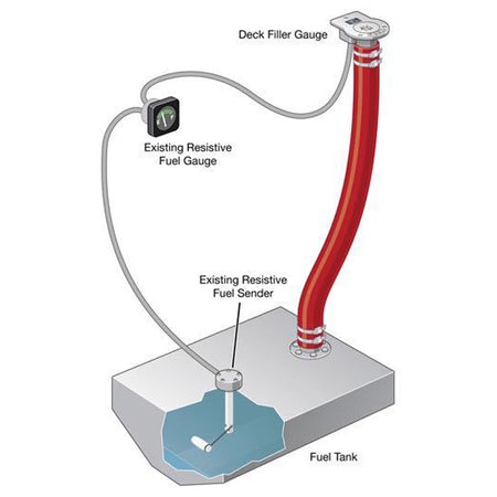 Eksklusiv dekkfylling med blå LED tanknivåindikator. Høypolert 316 rustfritt stål. Brukbar for 12 eller 24V systemer, enkel å installere og koble til det eksisterende analoge tankmålerinstrumentet.