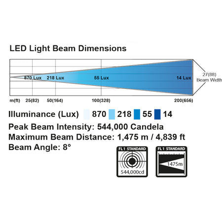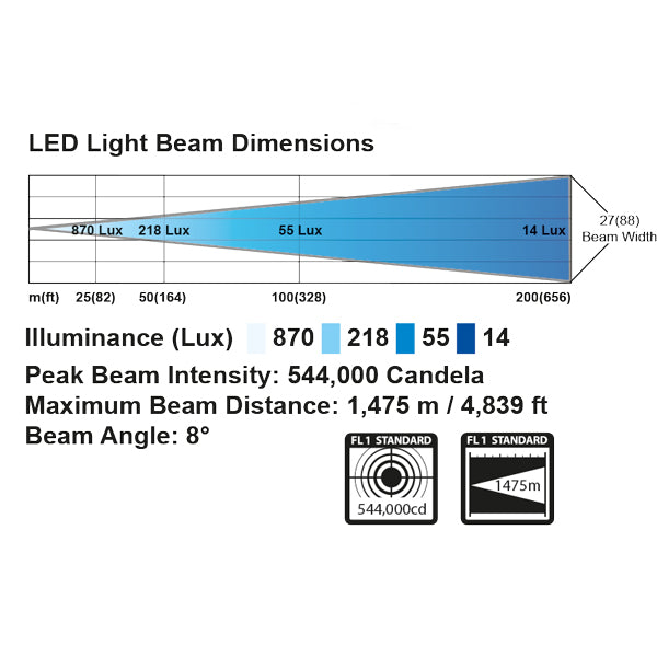 - Rekkevidde: Opptil 1400 meter med 0,25 lux