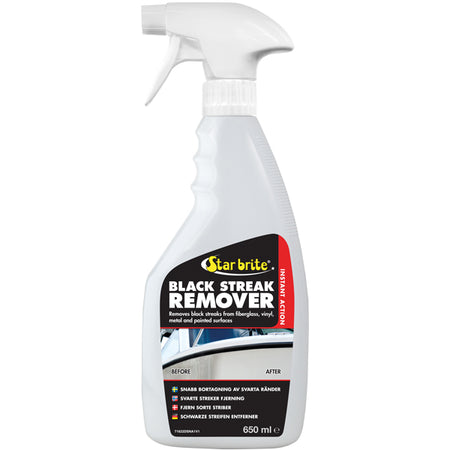 Star Brite Instant Black Streak Remover fjerner enkelt svarte striper fra gelcoat, vinyl, metall og lakkerte overflater. Påfør produktet direkte på det berørte området, la det virke i 30 sekunder og tørk av med en ren klut. For mer alvorlig berørte områder kan flere behandlinger være nødvendig. Husk å skylle grundig med rent vann etter bruk.