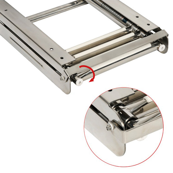 Badestigen er laget av rustfritt stål og har brede, ovale trinn med et sklisikkert hvitt plastbelegg, som sikrer godt grep under bruk. Teleskopfunksjonen gjør at stigen kan foldes sammen til en kompakt kassett, som er utstyrt med en fallsikker frontlås for ekstra sikkerhet.
