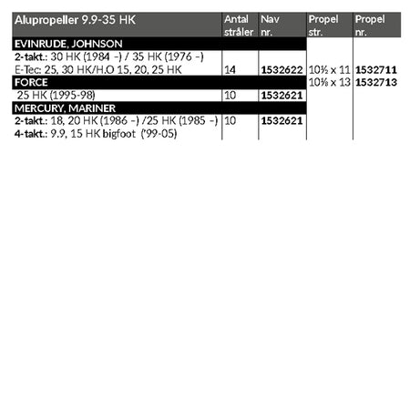 Hvis omdreiningene er for høye, anbefales det å velge en høyere økning. Hvis omdreiningene er for lave, bør du velge en lavere økning. Endringer i propellstigningen med 2" vil påvirke RPM med ca. 400 rpm. For vannsport kan en 2" reduksjon i propellstigningen være nødvendig for optimal ytelse.