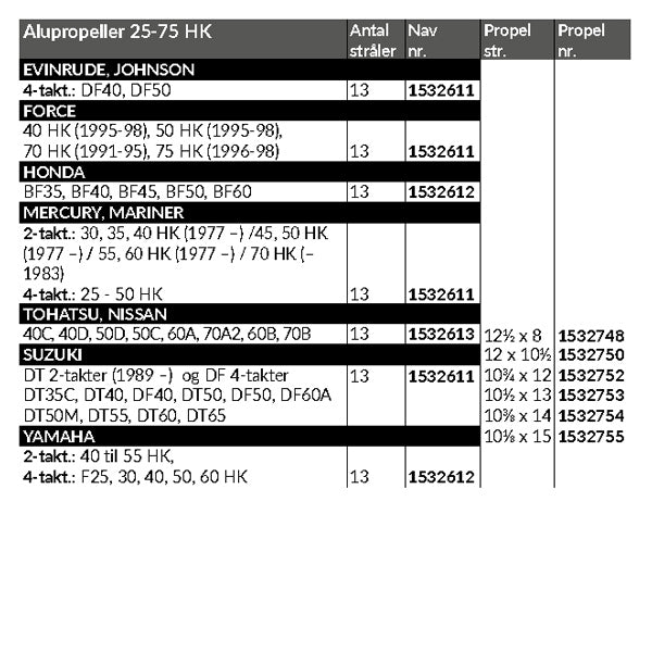 - YAMAHA: 2-takts: 40 til 55 HK; 4-takts: F25, 30, 40, 50, 60 HK