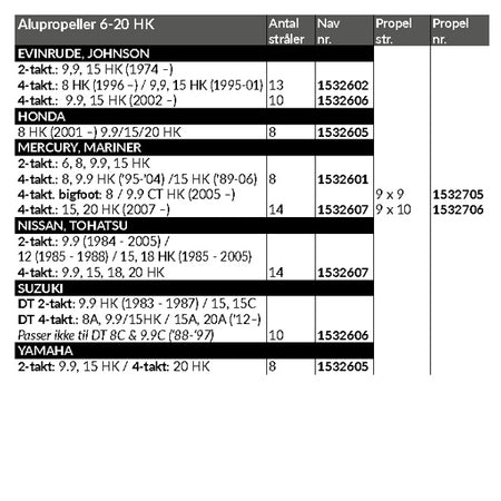 - SUZUKI: DT 2-takts: 9,9 HK (1983 - 1987), 15, 15C, DT 4-takts: 8A, 9,9/15HK, 15A, 20A ('12–) - Passer ikke DT 8C og 9,9C ('8) -'97)