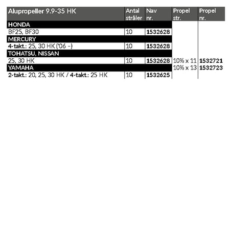 Hvis omdreiningene er for høye, bør du velge en høyere økning. Hvis omdreiningene er for lave, kan en lavere økning være løsningen. Vær oppmerksom på at en 2" endring i propellstigning vil påvirke rpm med ca. 400 rpm. For vannsport kan det være nødvendig å redusere propellstigningen med 2" for optimal ytelse.